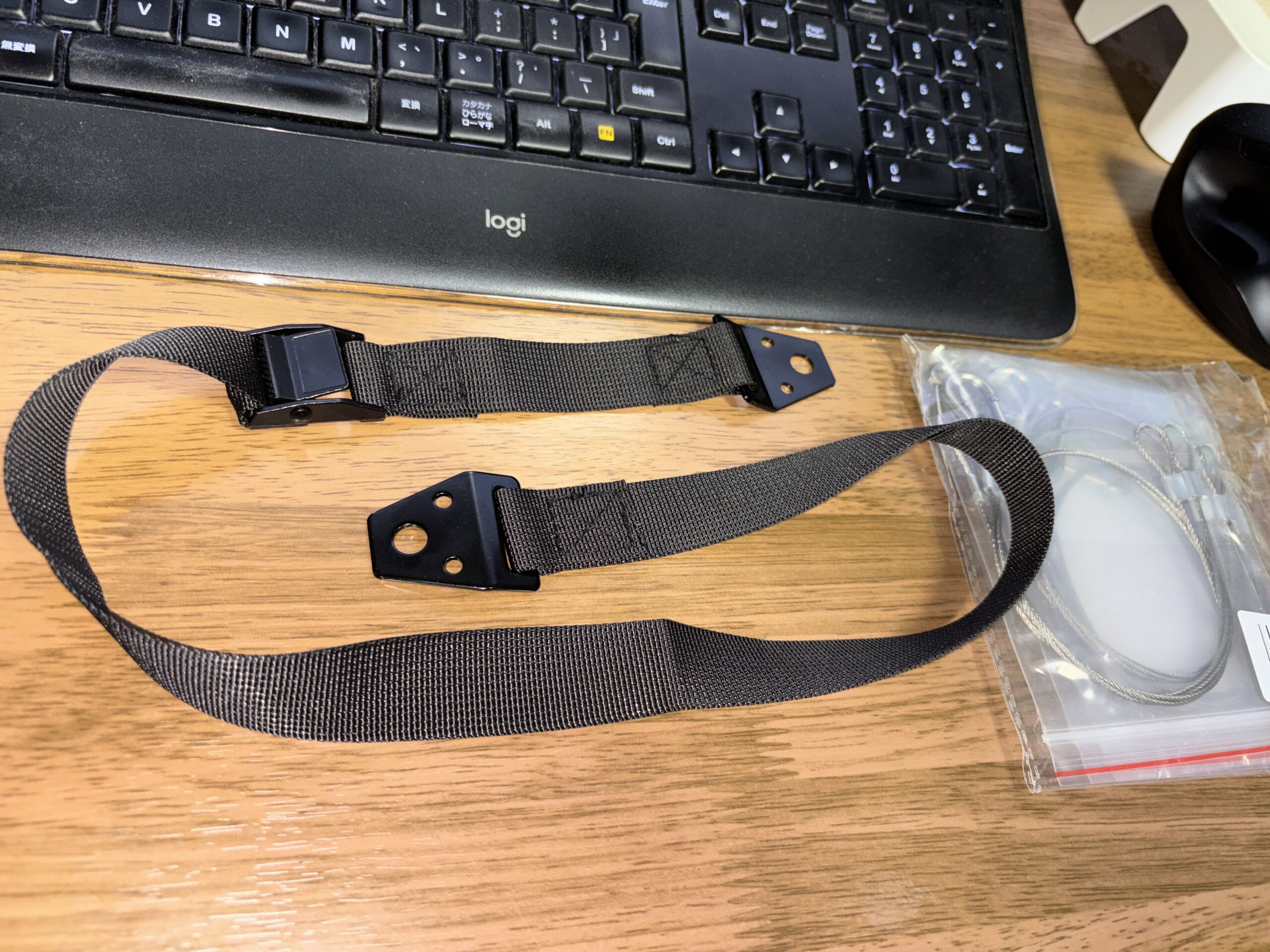 テレビスタンドとスペーサーの間には耐震ジェルシートを挟めていますが、テレビ台とスペーサーは固定されていない状態。とは申せスペーサーごと滑らせてテレビの位置合わせが楽に出来たので、ガチガチに固定されていないことは好都合でした。ただ、やはり地震は怖い。テレビの後ろと壁をつないでいる紐的なものを追加することで支えを増し、強い震度の地震が来てもテレビそのものはぶっ飛んで来ないようにします。